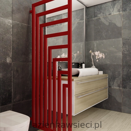Grzejnik Angus w wersji ściany działowej bazuje na geometrycznym wzorze graficznym. Prostopadły układ w tej wersji sprzyja lepszemu obiegowi ciepła w pomieszczeniu i pozwala dowolnie organizować przestrzeń. Zwiększone odległości między poziomymi profilami umożliwiają swobodne odwieszanie ręczników